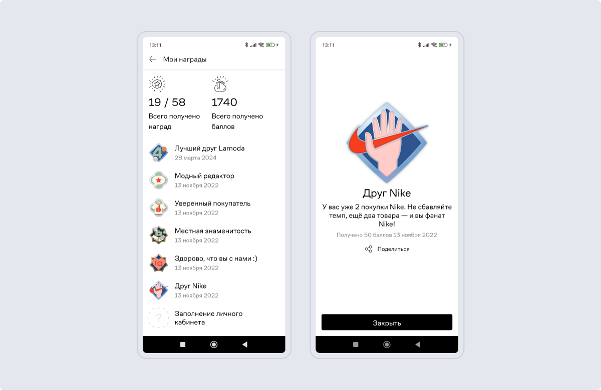 В приложении «Lamoda» пользователя награждают значками за покупки товаров отдельных брендов, а также за лояльность и активность в отзывах. Кнопка «Поделиться» на экране значка способствует сарафану.