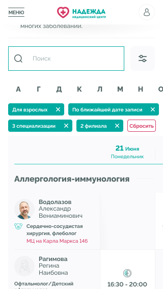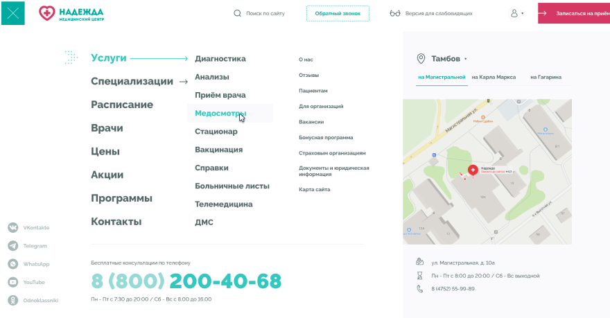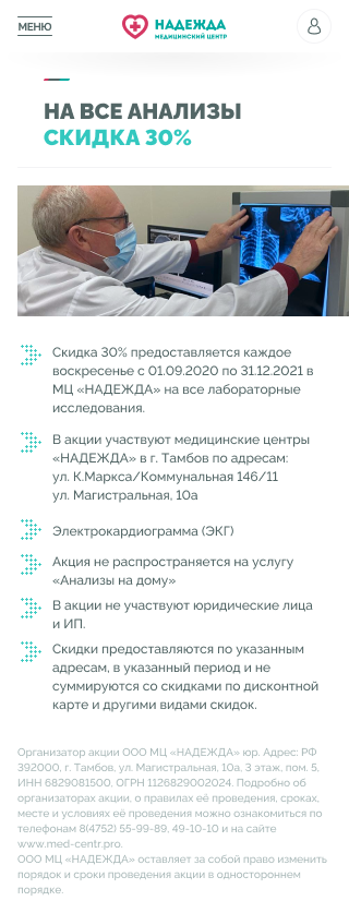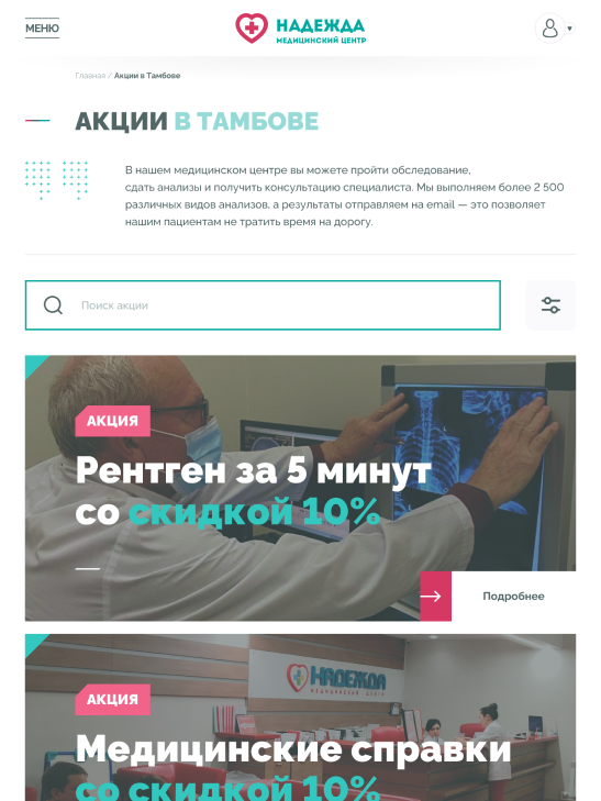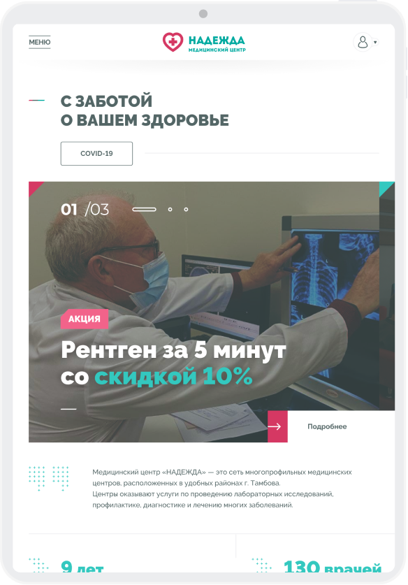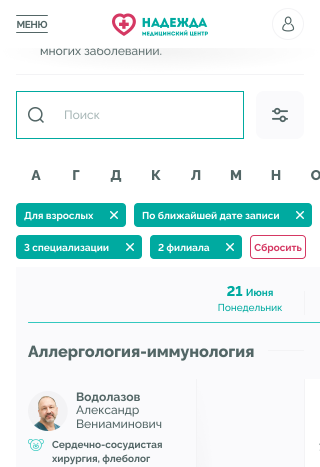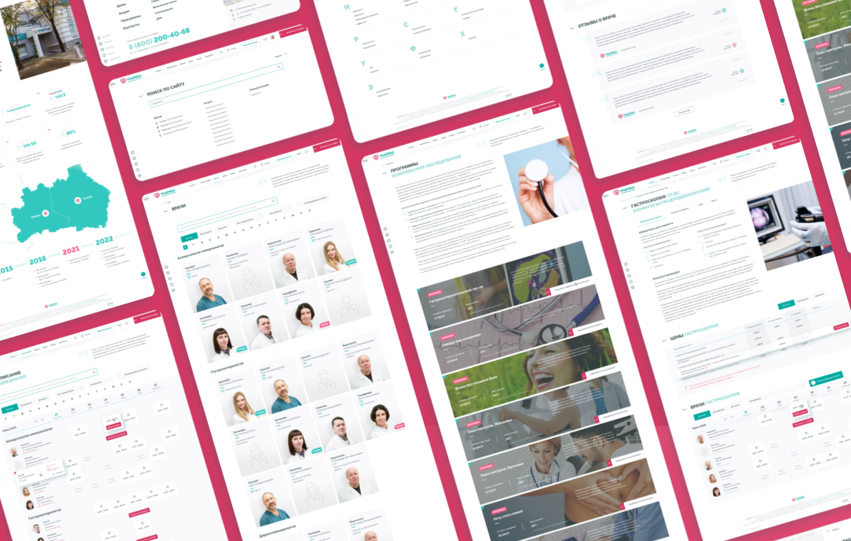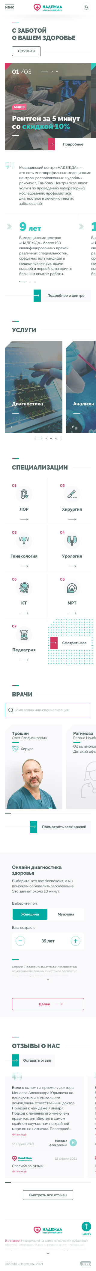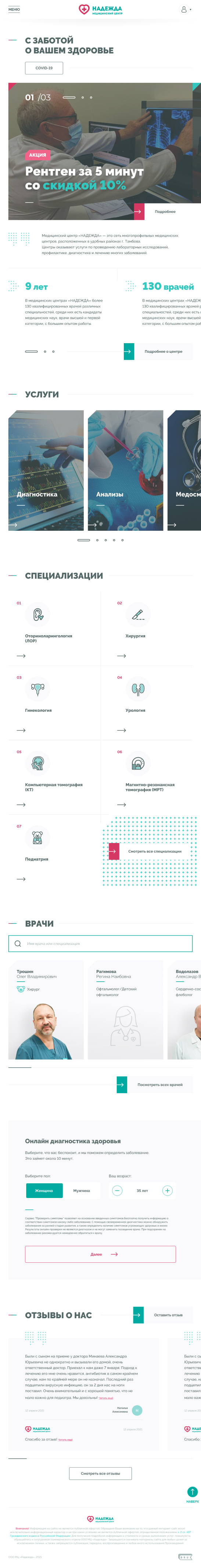 Медицинские центры «НАДЕЖДА» оказывают большой спектр услуг по проведению лабораторных исследований, профилактике, диагностике и лечению заболеваний.Проблема. Медицинский центр не успевает обрабатывать 30% входящих звонков, а через сайт записываются не более 300 пациентов в месяц.Задача. Сократить количество звонков и увеличить количество записей через сайт.Решение. Разработать интуитивно понятный интерфейс нового сайта и улучшить пользовательский опыт для записи на приём.
