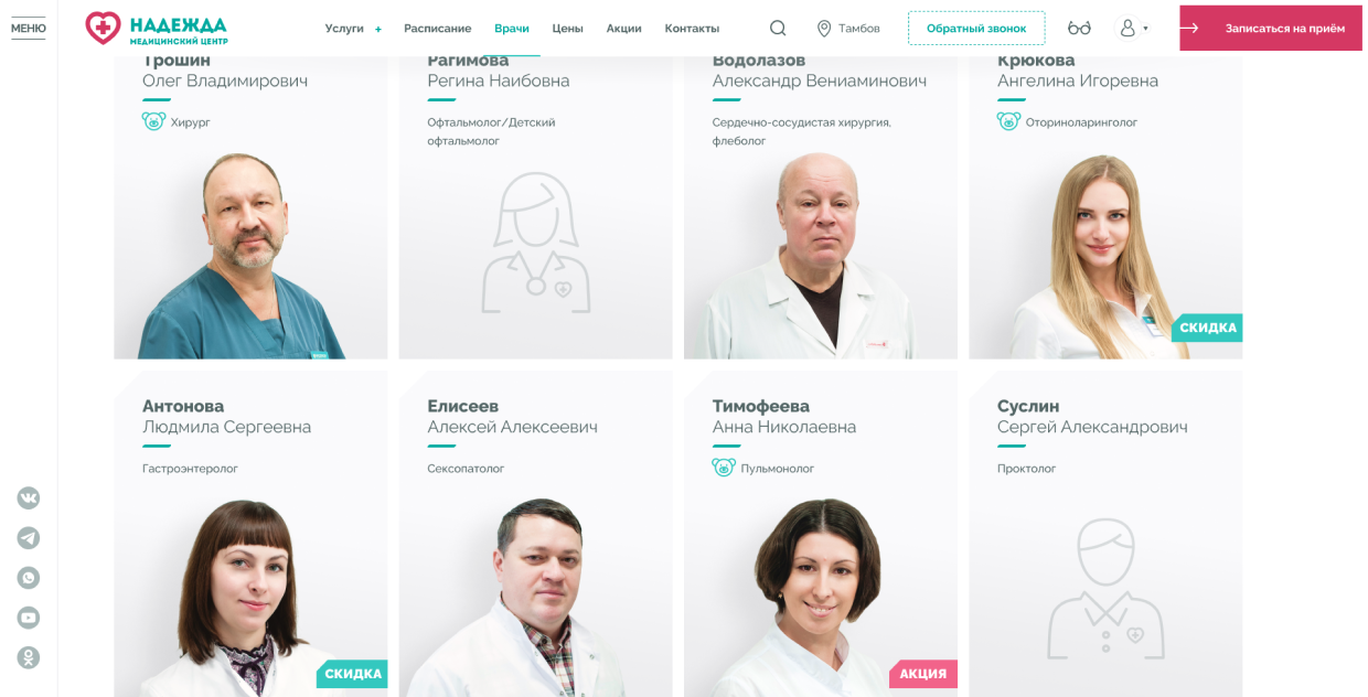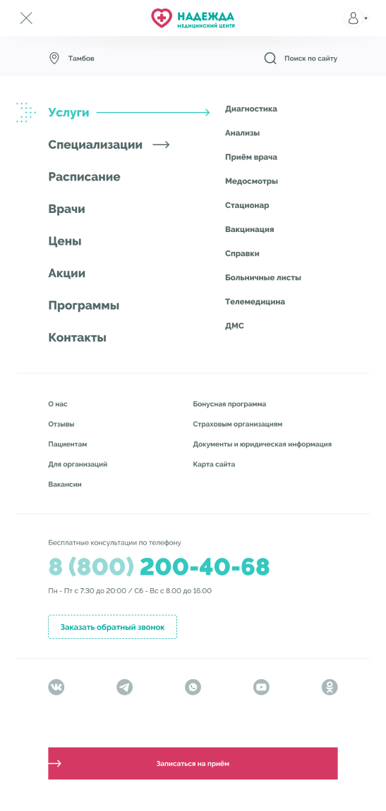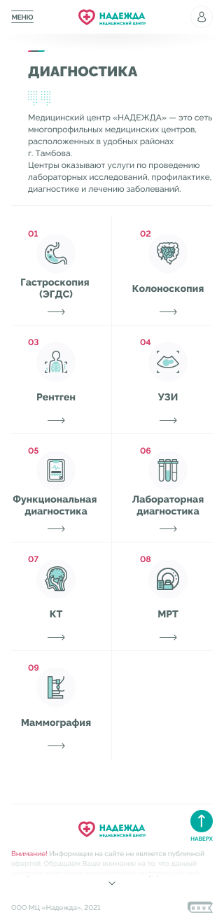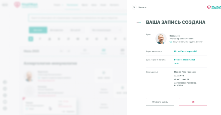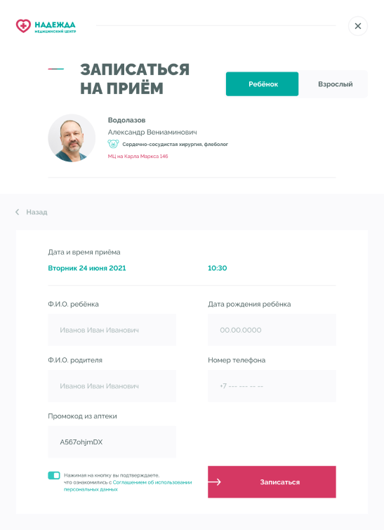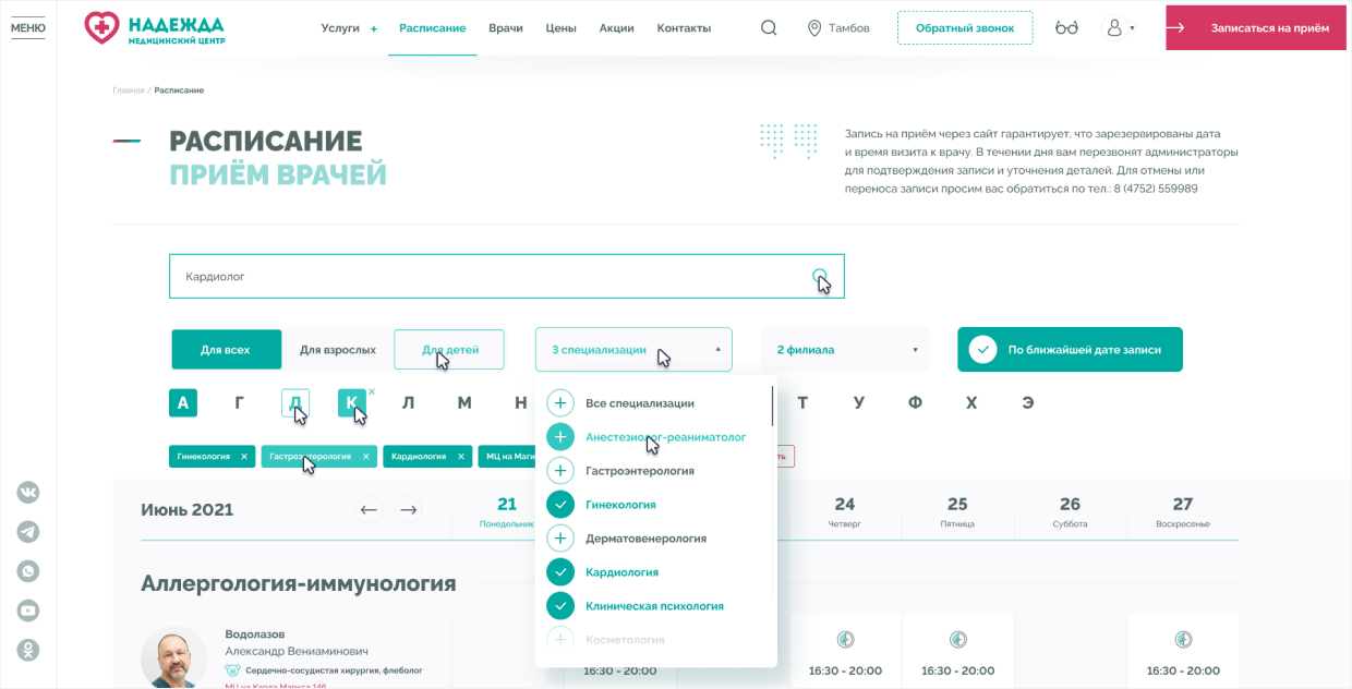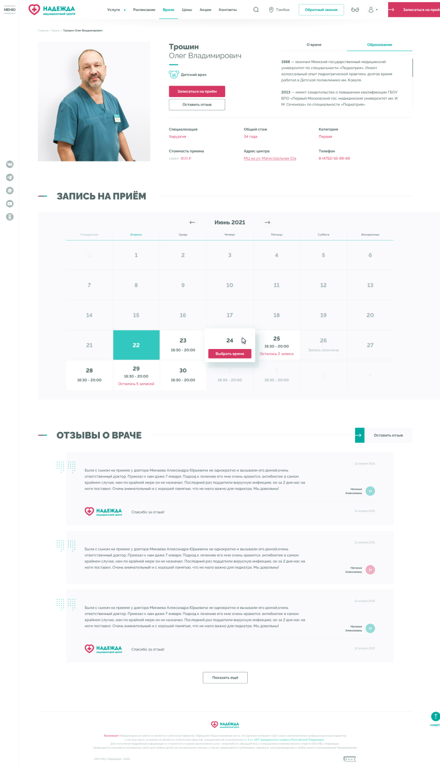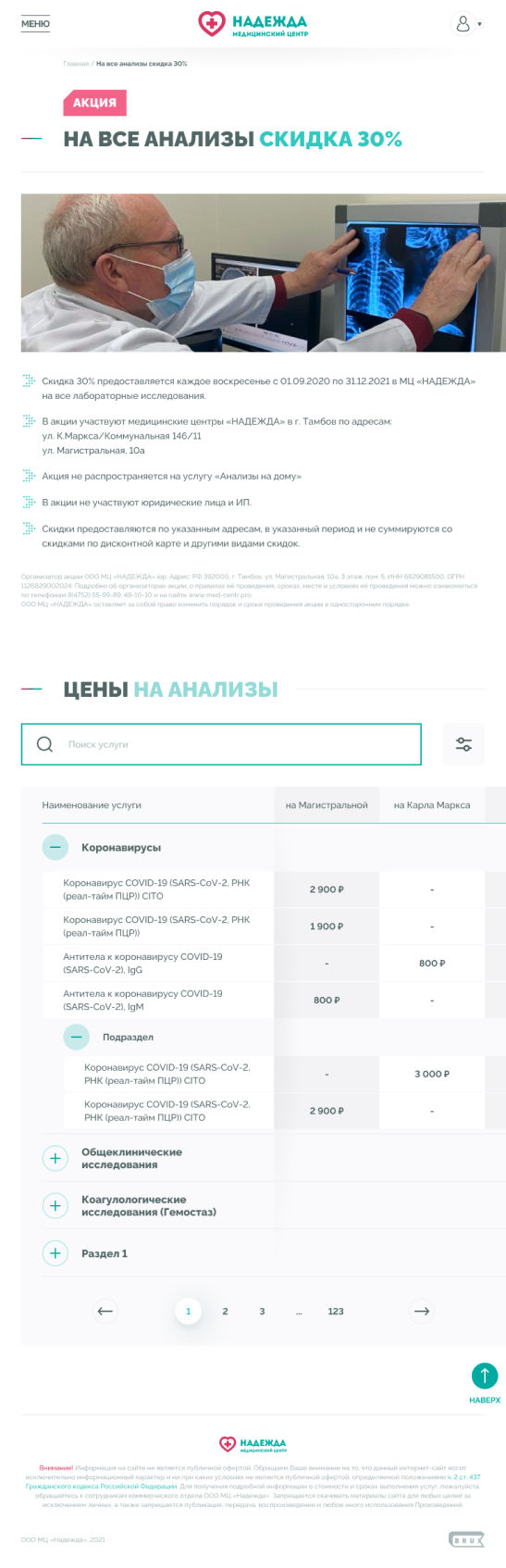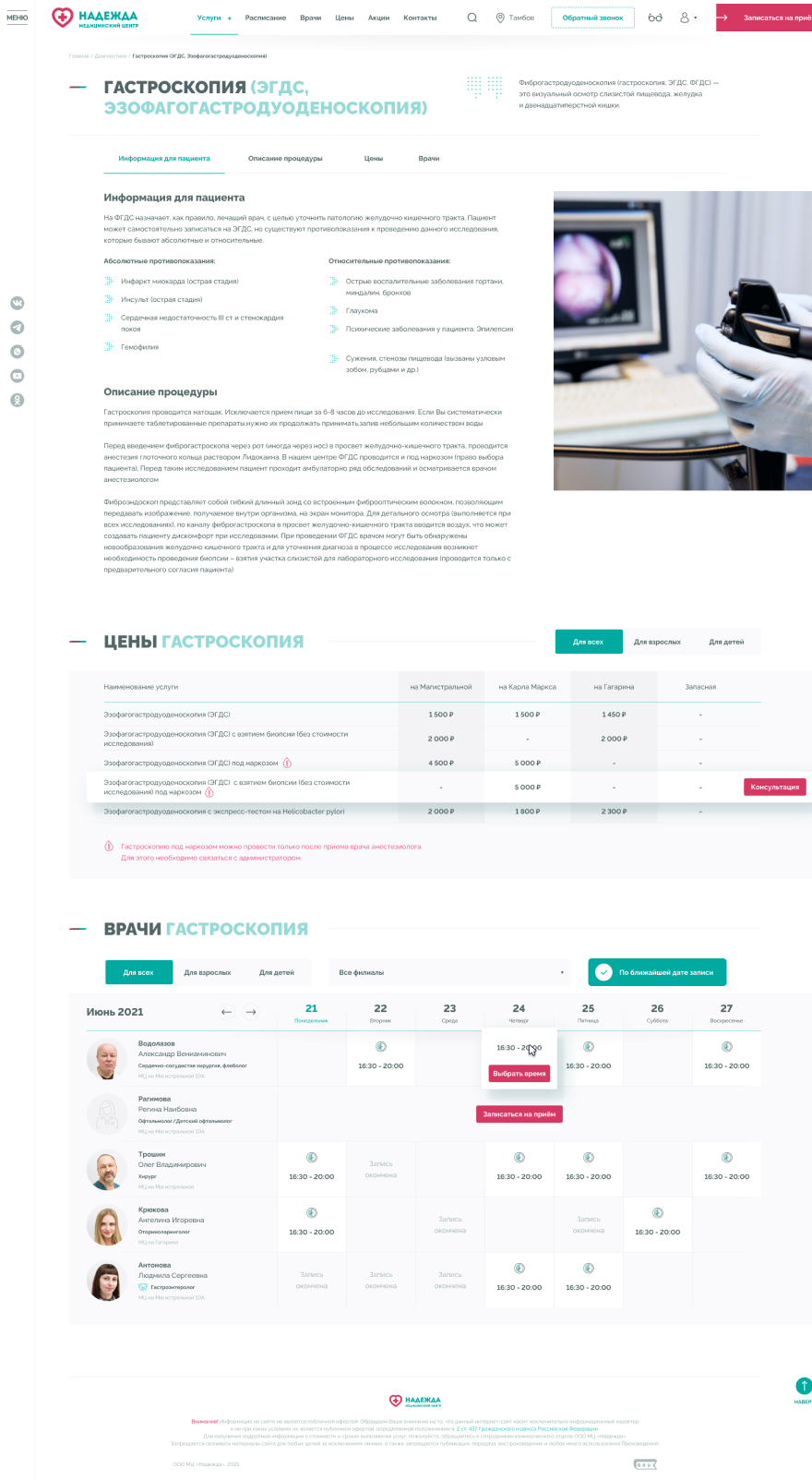 Медицинские центры «НАДЕЖДА» оказывают большой спектр услуг по проведению лабораторных исследований, профилактике, диагностике и лечению заболеваний.Проблема. Медицинский центр не успевает обрабатывать 30% входящих звонков, а через сайт записываются не более 300 пациентов в месяц.Задача. Сократить количество звонков и увеличить количество записей через сайт.Решение. Разработать интуитивно понятный интерфейс нового сайта и улучшить пользовательский опыт для записи на приём.