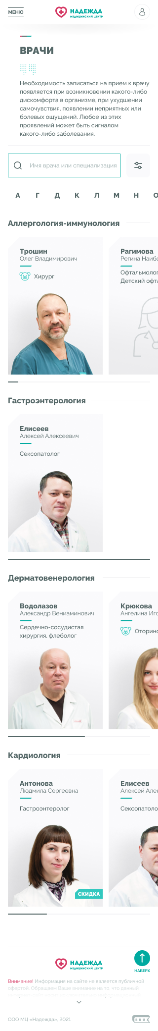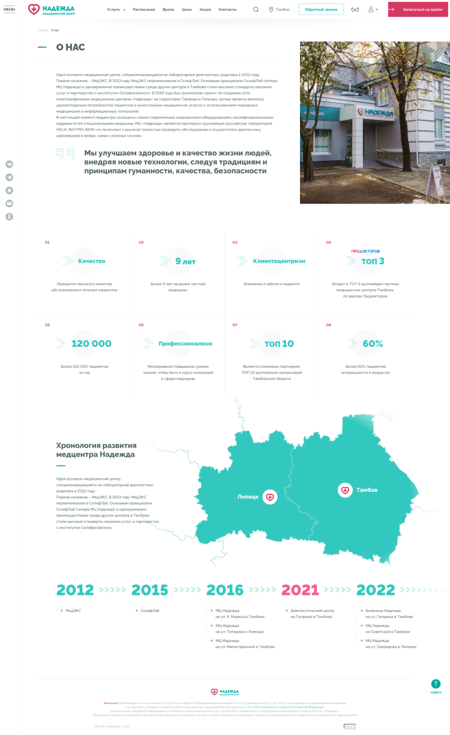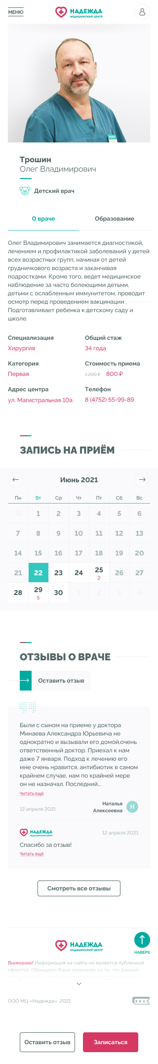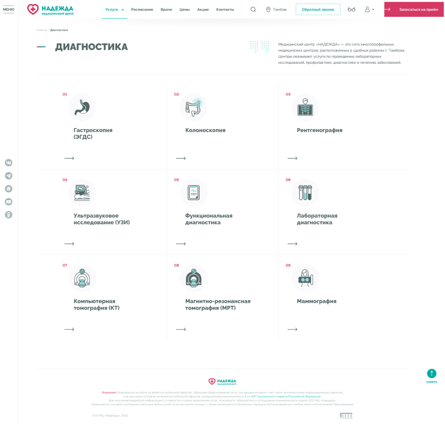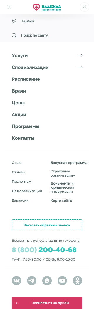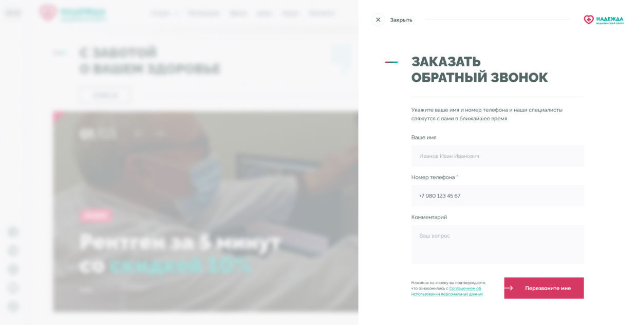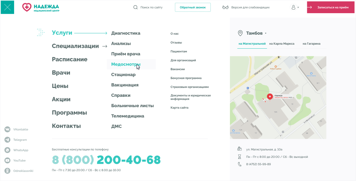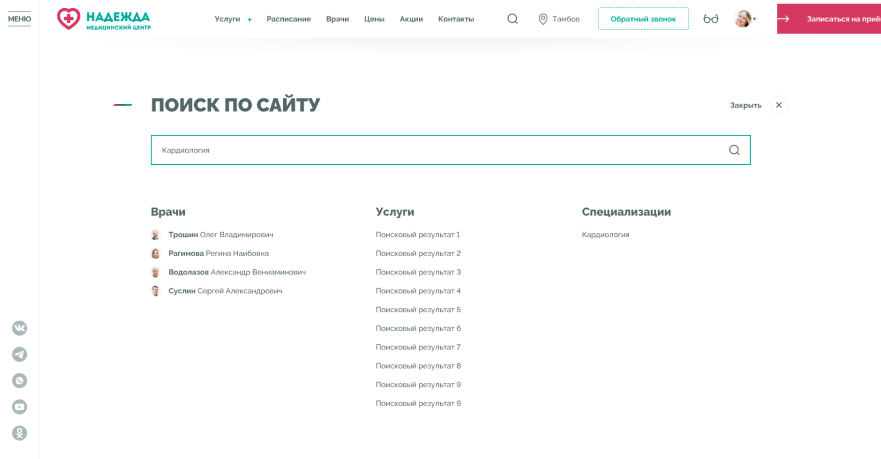 Медицинские центры «НАДЕЖДА» оказывают большой спектр услуг по проведению лабораторных исследований, профилактике, диагностике и лечению заболеваний.Проблема. Медицинский центр не успевает обрабатывать 30% входящих звонков, а через сайт записываются не более 300 пациентов в месяц.Задача. Сократить количество звонков и увеличить количество записей через сайт.Решение. Разработать интуитивно понятный интерфейс нового сайта и улучшить пользовательский опыт для записи на приём.
