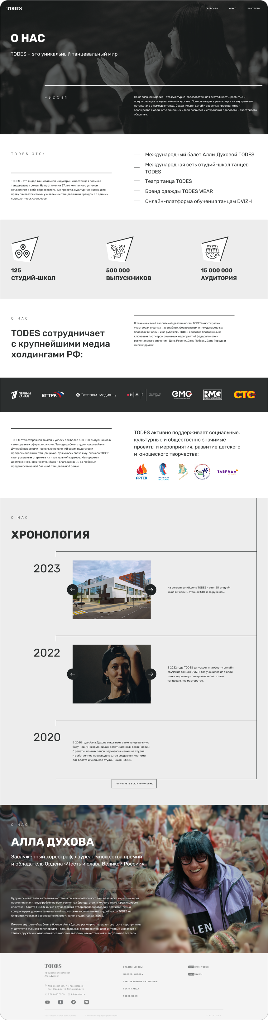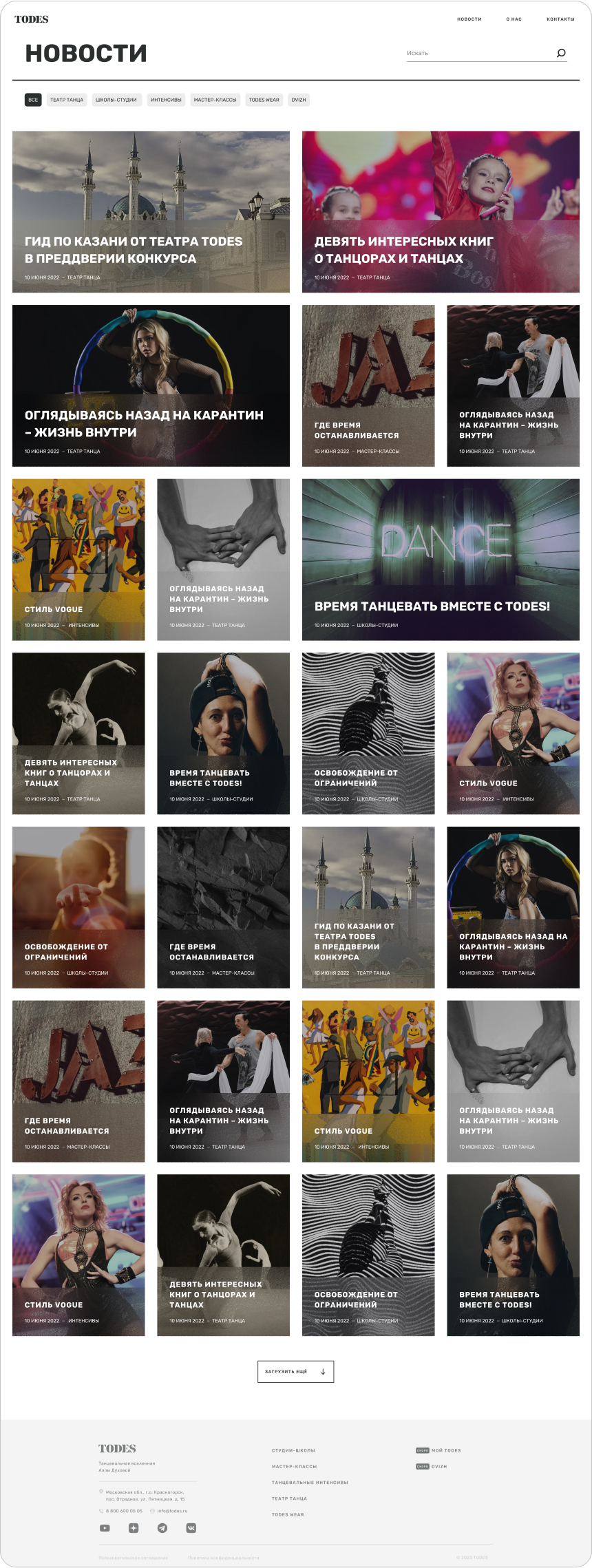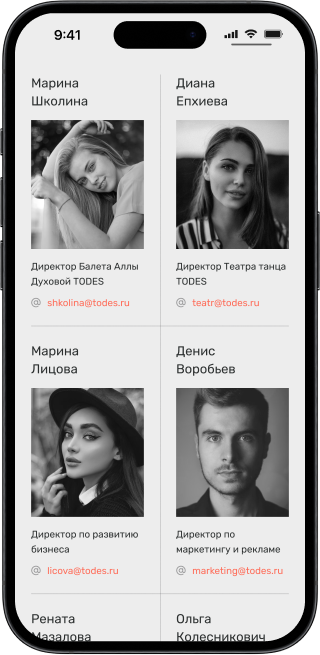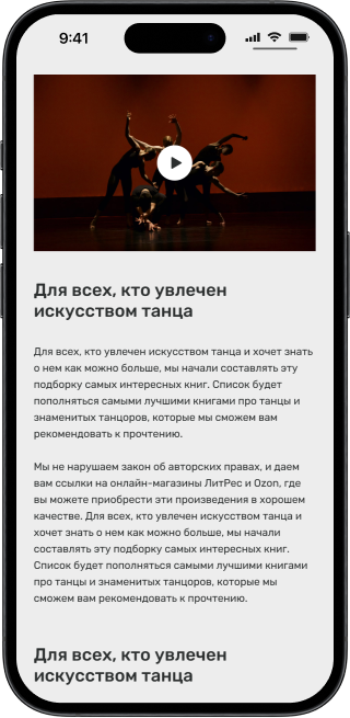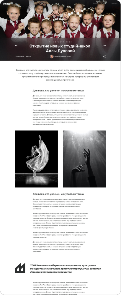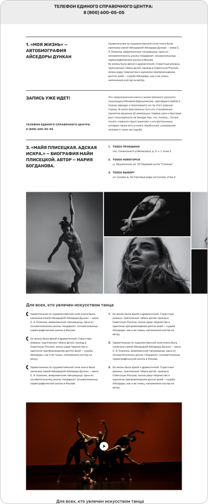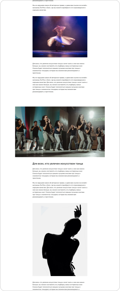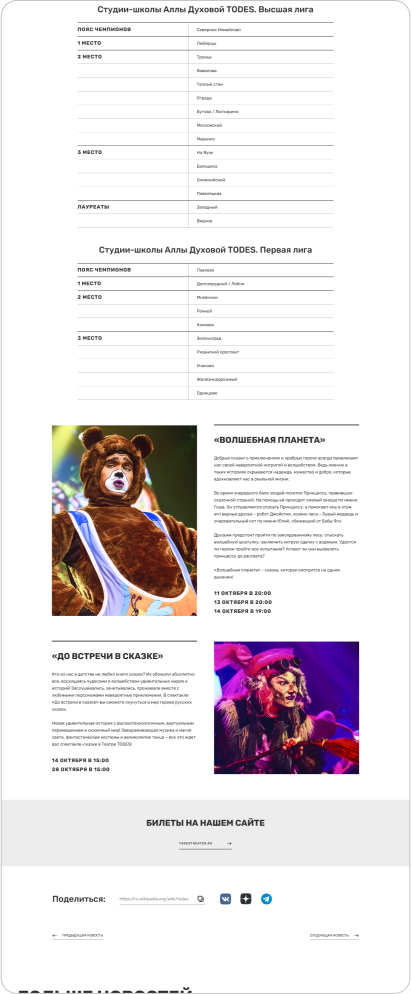 Для каждого направления требуются свои блоки, чтобы представить информацию в нужном формате. Например, для гастролей могут быть таблицы с расписанием, для фотогалереи — фотографии, а для текстовых блоков — акценты на разных аспектах.