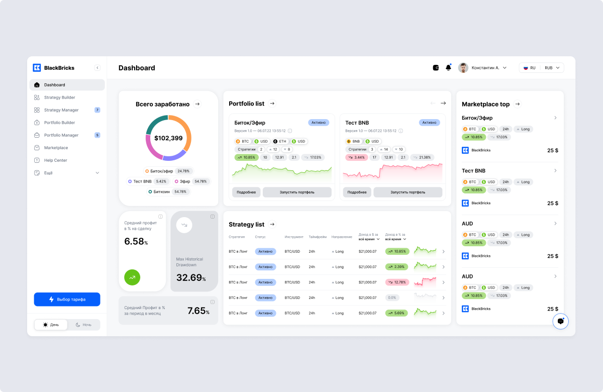 Разработанное нами приложение для криптоинвесторов BlackBricks пестрит цифрами и графиками