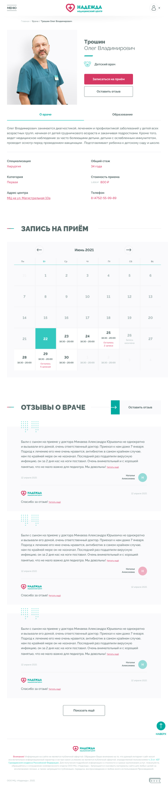 Медицинские центры «НАДЕЖДА» оказывают большой спектр услуг по проведению лабораторных исследований, профилактике, диагностике и лечению заболеваний.Проблема. Медицинский центр не успевает обрабатывать 30% входящих звонков, а через сайт записываются не более 300 пациентов в месяц.Задача. Сократить количество звонков и увеличить количество записей через сайт.Решение. Разработать интуитивно понятный интерфейс нового сайта и улучшить пользовательский опыт для записи на приём.